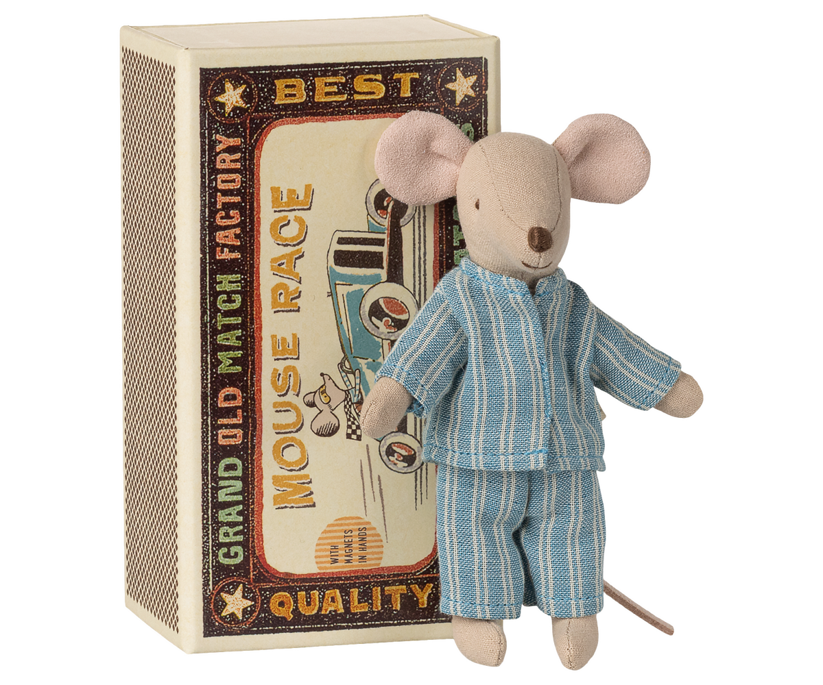 A classic Maileg item, this mouse is ready for hours of play and sleeps soundly in its little matchbox. The clothes and bedding are made of soft fabrics with unique prints in beautiful colors. The mouse has magnets in its hands. Fabric may vary.