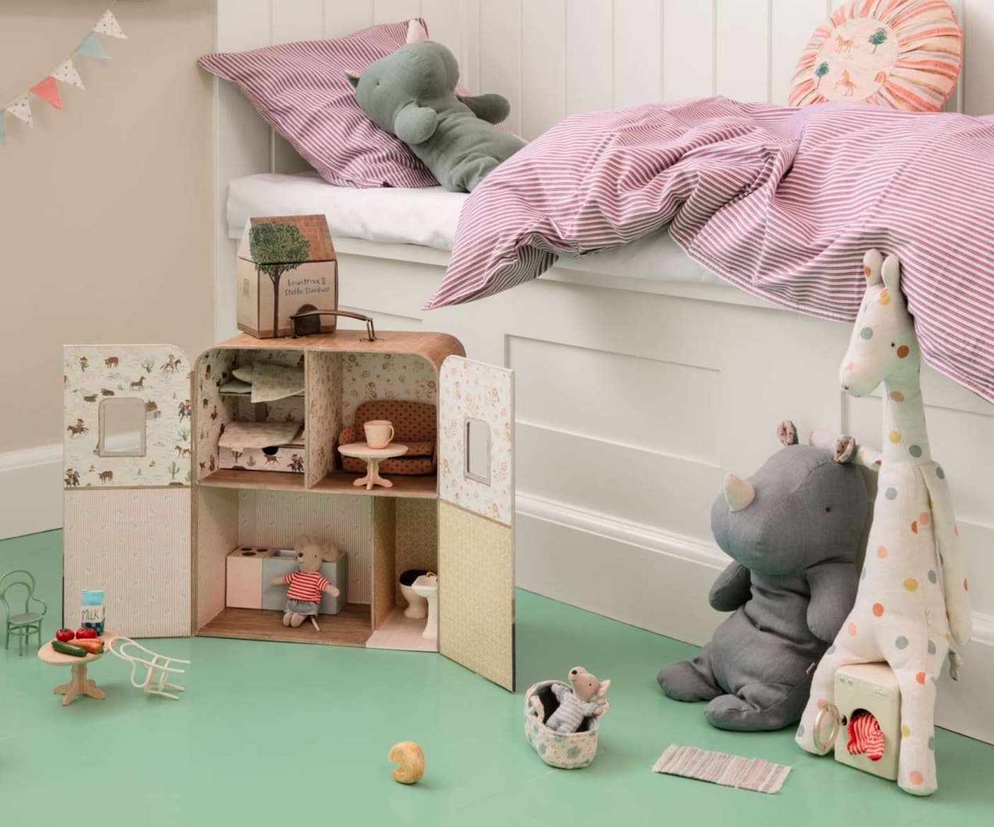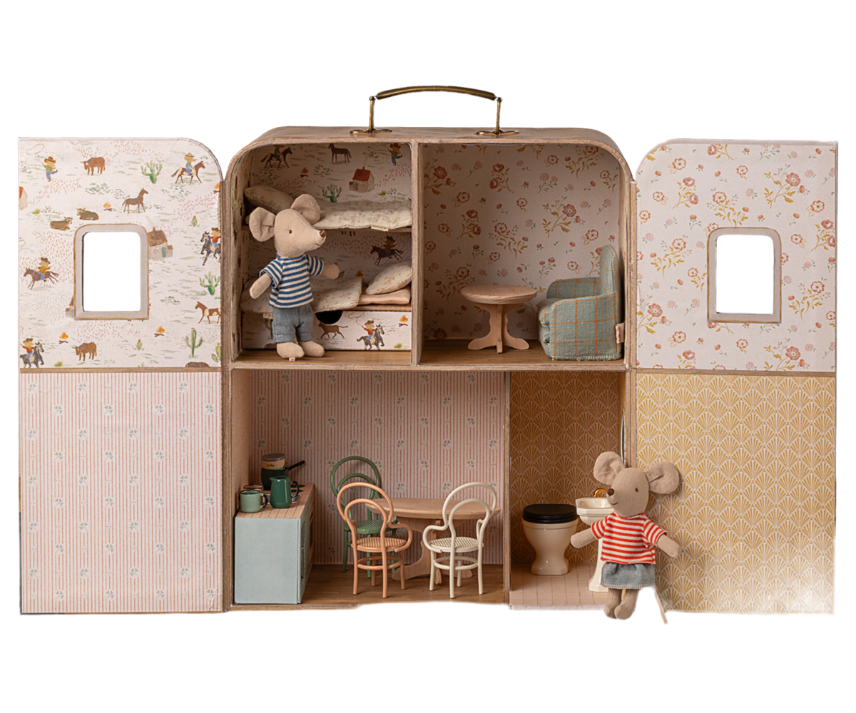 Create magical worlds wherever you go with the Maileg SuitCasa Portable House. This beautifully illustrated fold-open case transforms into a charming dollhouse complete with four cosy rooms and charming details, including two open windows and Maileg’s signature vintage wallpaper prints. Designed for on-the-go play, it features a sturdy carry handle and magnetic closures to keep everything tidy inside.