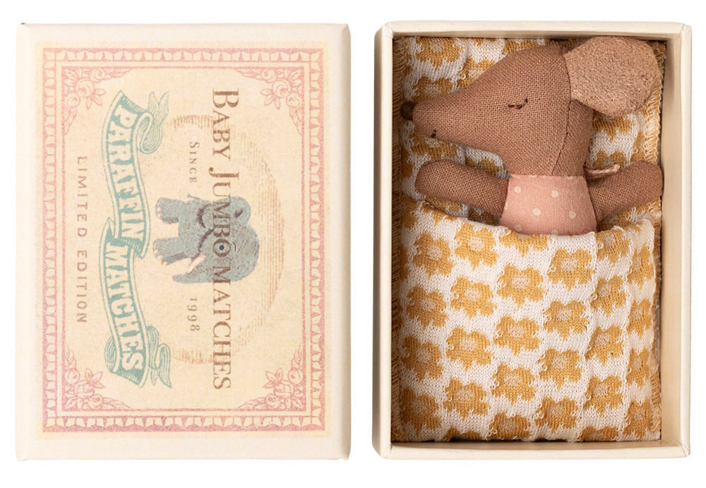 A classic Maileg item. This mouse is ready for hours of play and sleeps tight in the little matchbox. The clothes and bedlinen are made of soft fabrics with unique prints in beautiful colours.