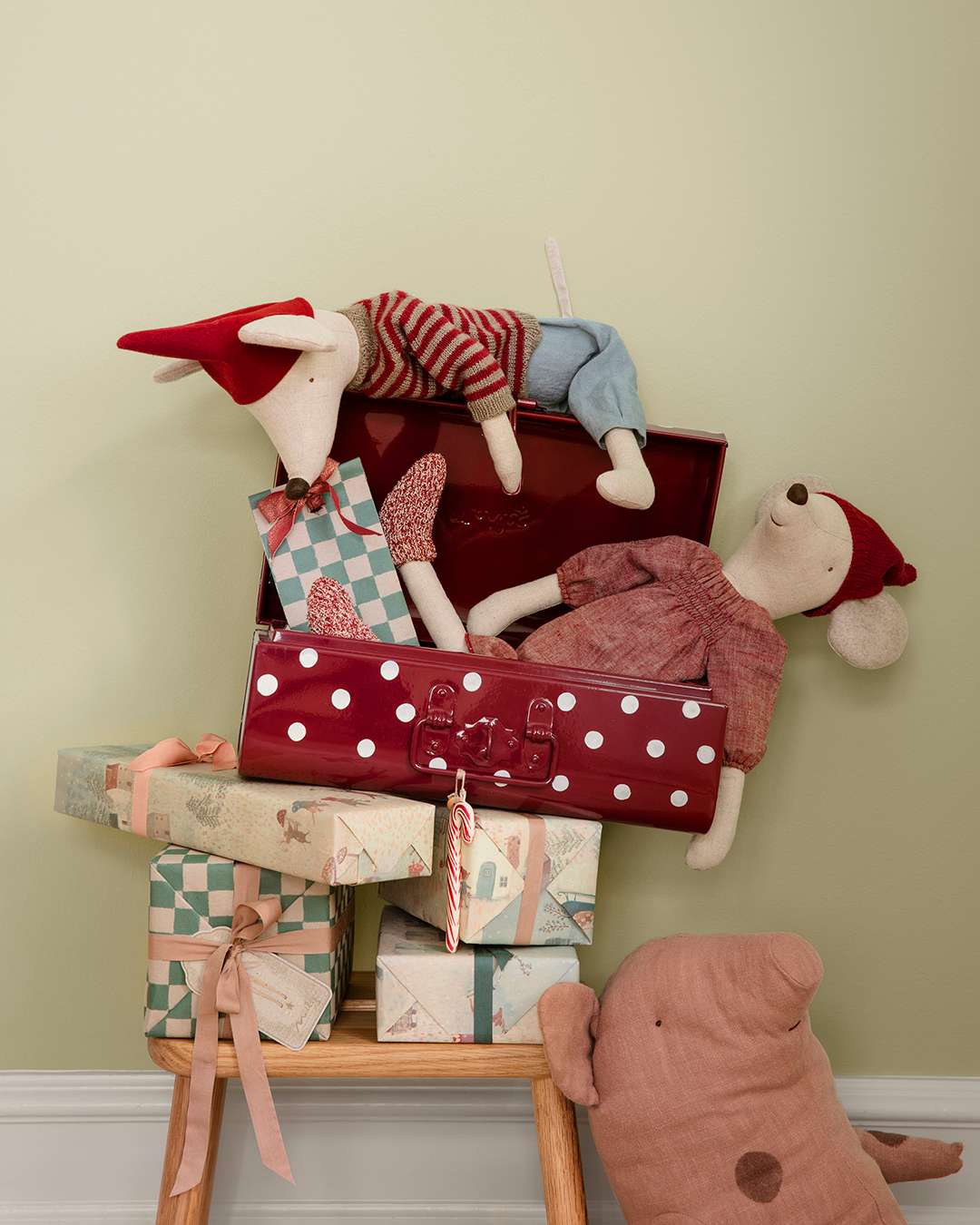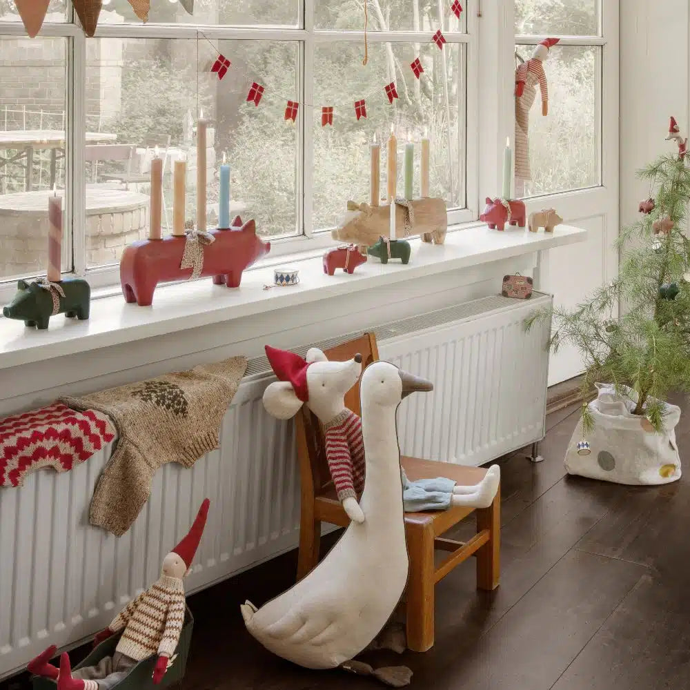 This mouse in size maxi wears his Christmas hat and warm sweater - the ears are made in extra thick fabric to keep them warm.