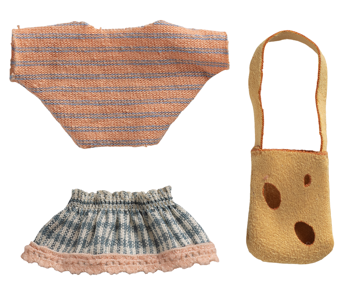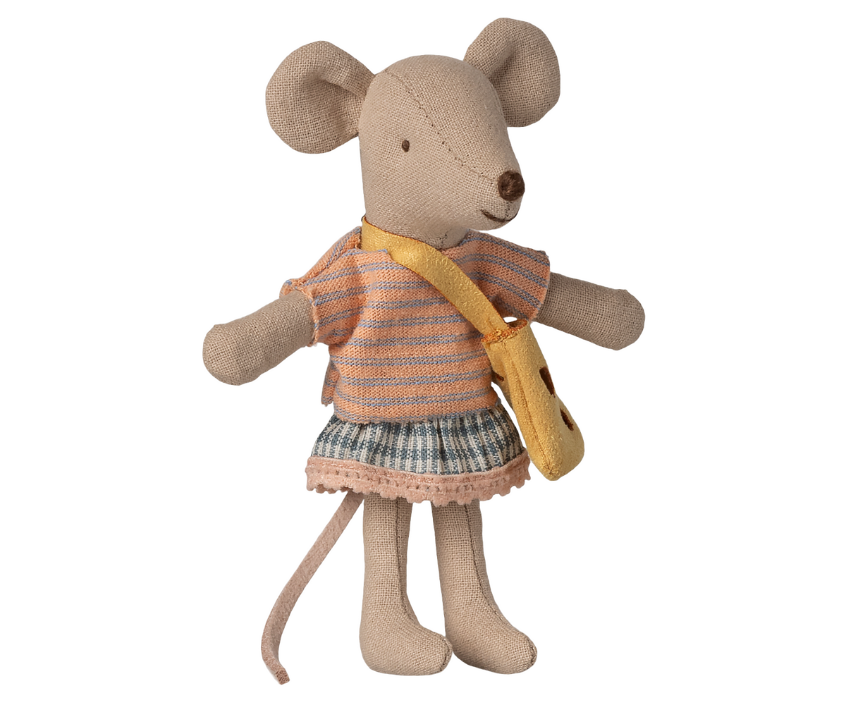 A little sister mouse beautiful dressed up for a playful day. She wears a small cheese bag for all her personal belongings and has magnets in hands. Add extra accessories and furniture to extend the play and storytelling about this new friend.