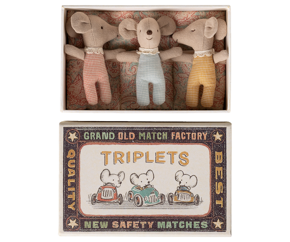 Maileg Triplets, Baby mice in matchbox - Checker SS26 PREORDER ONLY DUE JUNE is backordered and will ship as soon as it is back in stock.