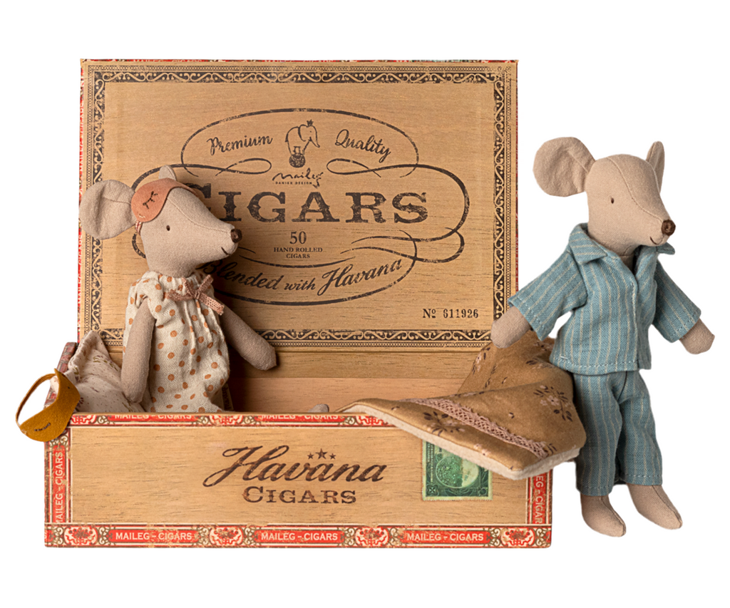 Mum and Dad love to rest in a nice Cigar Box bed, which is the perfect size for two! Pair our Mum and Dad mice as you wish or buy them as a pair in their cozy bed. Give them a family too if you’d like. What does your mouse family look like?