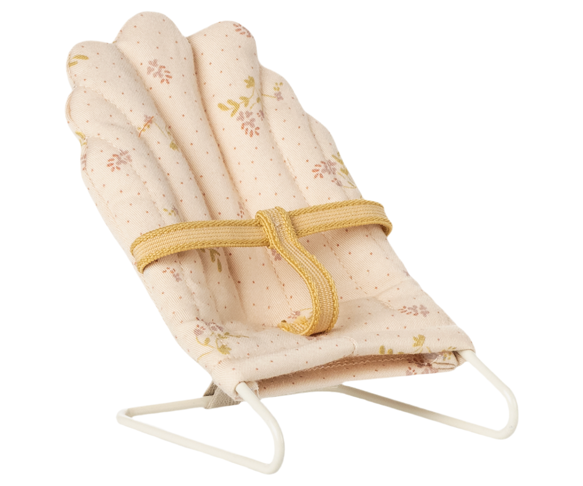 Perfectly sized for Maileg's micro rabbits and bunnies, the Maileg Babysitter Micro in off-white is a charming and functional addition to any miniature nursery. Featuring a soft floral pink fabric seat with delicate golden straps and a sturdy metal frame, this babysitter offers both comfort and style for the tiniest members of the Maileg family. Ideal for imaginative play, it’s a lovely accessory that blends vintage charm with sweet practicality.