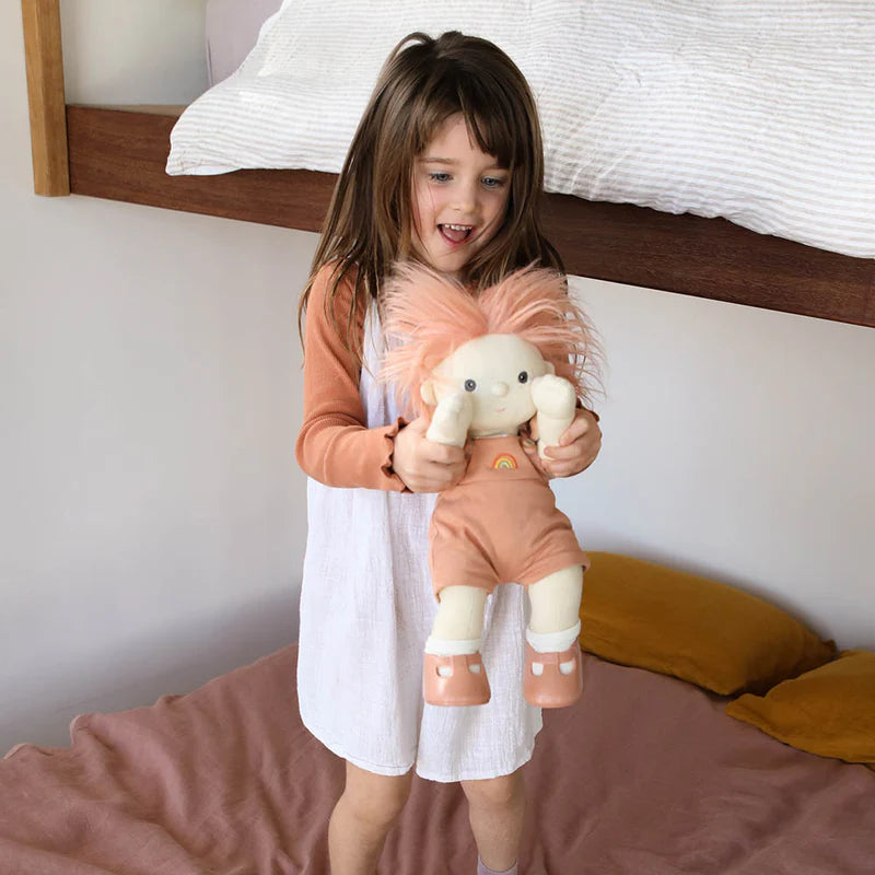 Crafted with the softest cotton outer and the signature Dinkum embroidered details — twinkling eyes, a sweet little mouth, and a rainbow stitched over the heart — Birdie is made to be cherished. She arrives wearing her removable knitted romper, socks, nappy, and shoes, all perfectly sized for tiny hands to dress and redress.