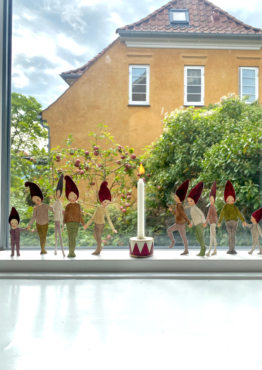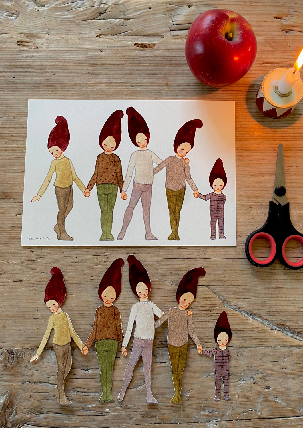 This merry gang of Danish elves is brimming with Christmas mischief. Each paper cut-out carries Tall Hat Tales’ signature whimsy, rosy cheeks, pointy hats, and a sparkle of storybook magic.This set of woodland elves, pairs perfectly with Elves Gang 2 to expand your festive scene. Cut them out and attach them to shelves, mantels and windowsills with a small piece of tape. Mix and match for a full elf parade or let them create their own mischief peeking out from stockings and advent calendars. Made for slow, screen-free play and cozy evenings surrounded by fairy lights and cocoa.