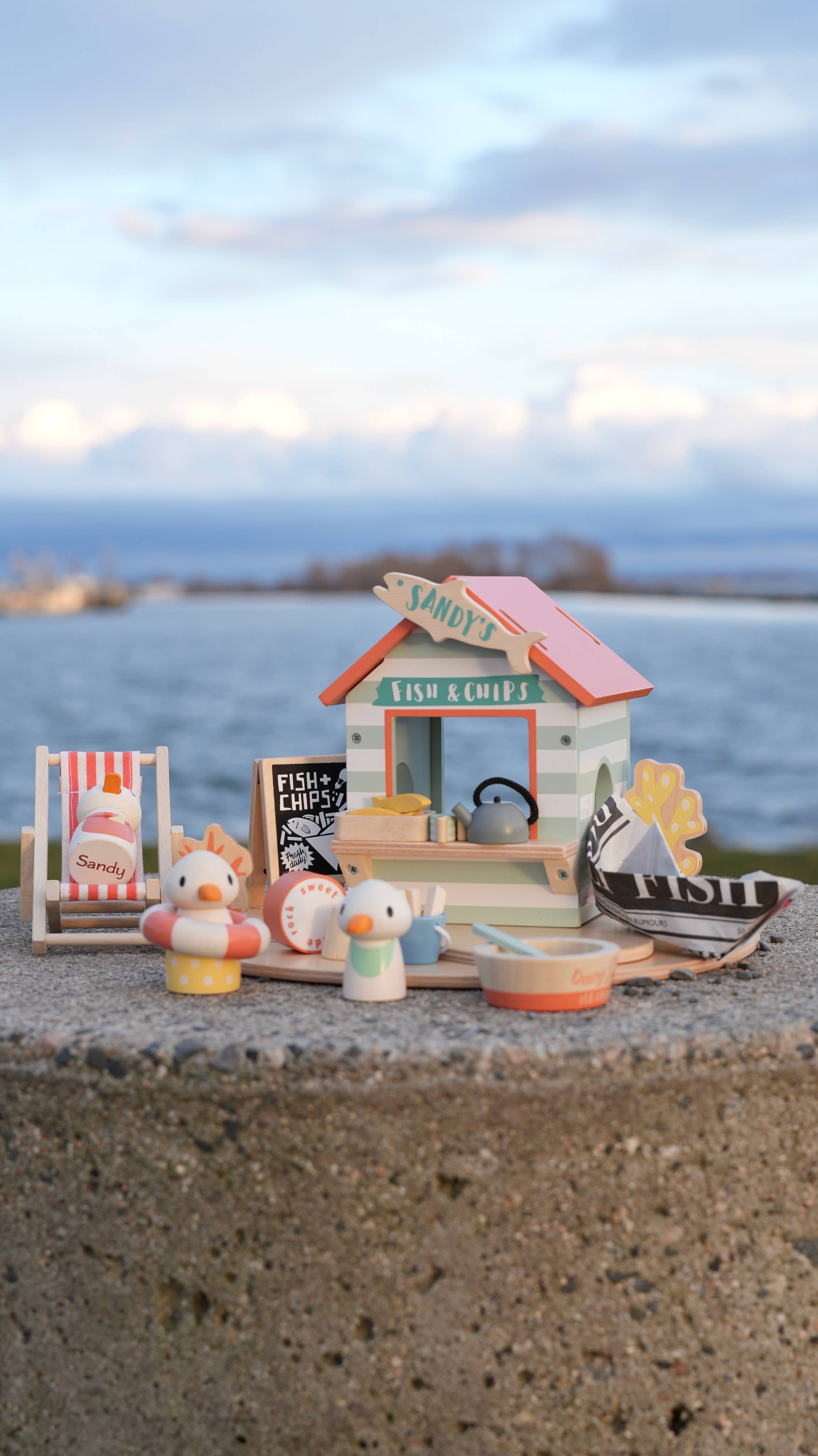 • Includes: beach hut, Sandy and family seagulls, seaweed, deckchair, kettle, wooden tub of ice cream and spoon, three fish in a dish, bucket of chips, fish & chips sign, sandcastle, candy rock and newspaper boat