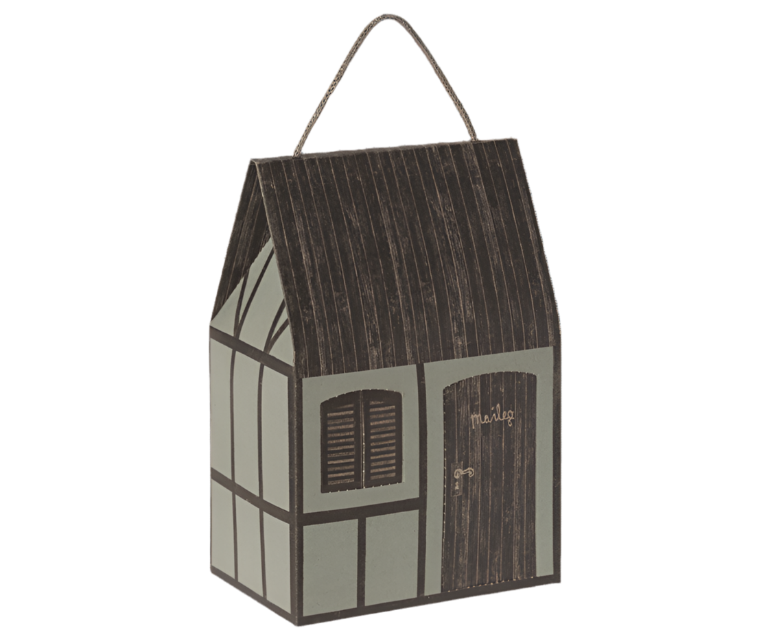 A paper bag shaped like a small house with a door and window. This is the perfect giftwrap for any small Maileg gift and will ensure the story will start before the gift is opened.