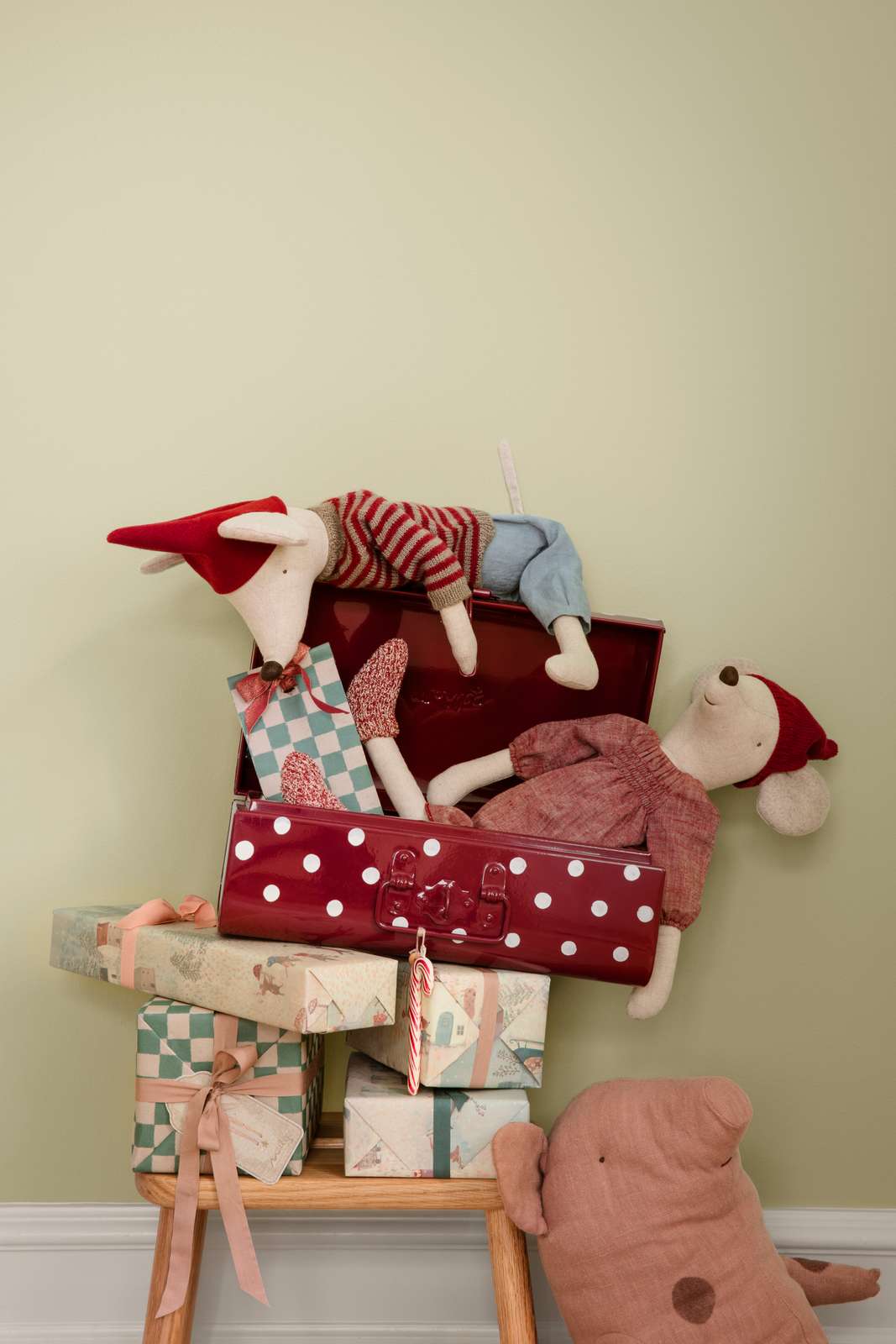 This sweet mouse in size maxi wears a knitted christmas hat and socks together with a beautiful red dress - the ears are made in extra thick fabric to keep them warm.