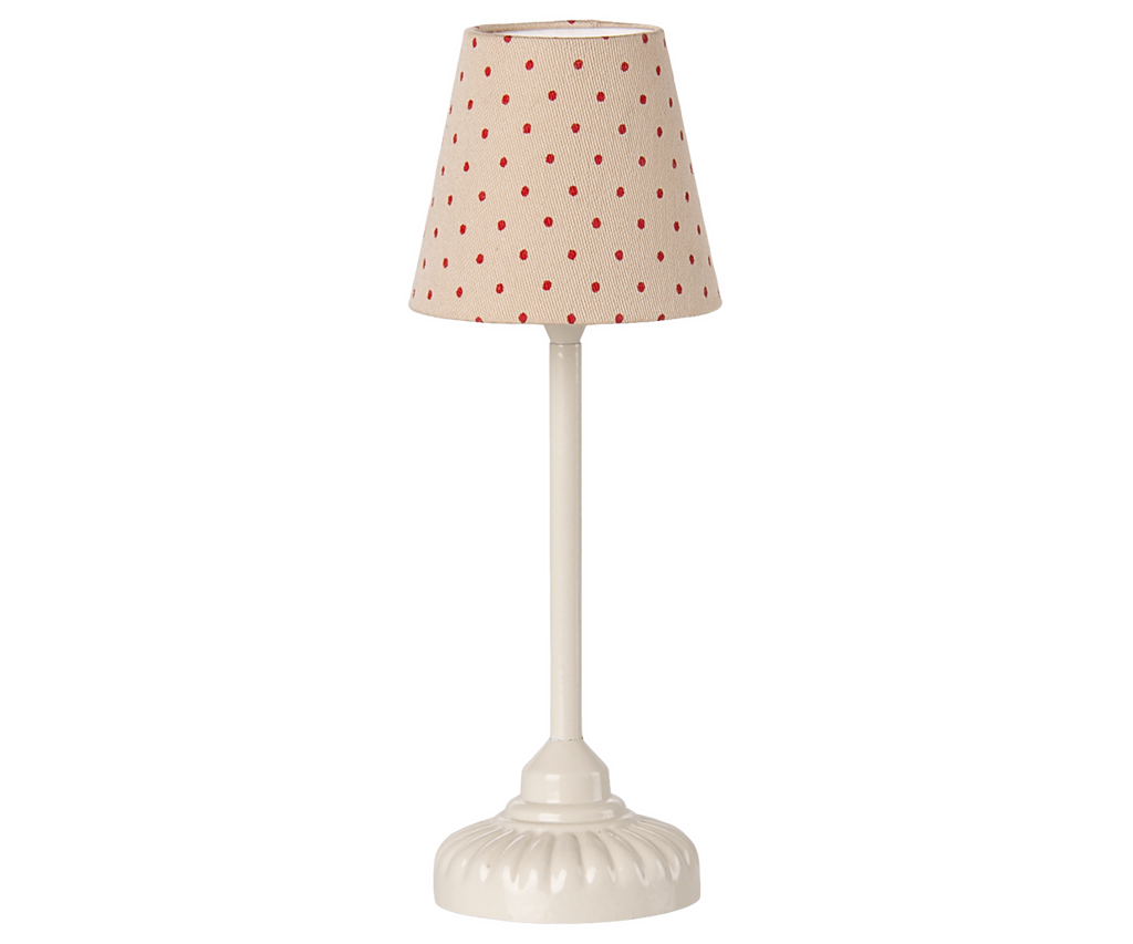 The beautiful Maileg vintage floor lamp is a must-have. The lamp will light up the room with a soft tone - remember to turn off the light when our friends go to bed. The product comes without battery. You can add a coin cell battery (CR2032).