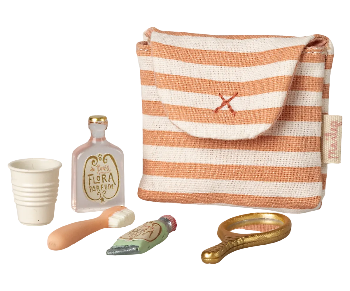 A small bag full of everything you need for the everyday routine before bedtime. A toothbrush, cup, mirror, cream and a parfume bottle will for sure set the perfect playscene for many stories to be told about the mouse family.