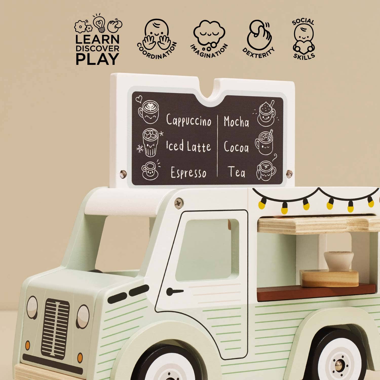 Lift the flip-top roof to reveal a cosy coffee and tea menu board, or open the front service hatch to take orders, serve treats and chat to customers. Whether little baristas want to serve cappuccinos, herbal brews or something freshly baked, this van is ready for endless storytelling adventures.