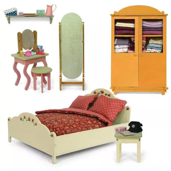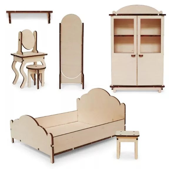 Create a bedroom with this furniture kit! The pre-cut wooden parts are easy to assemble with the simple instructions and have a scale of 1:12. Based on the Mouse Mansion book series by Karina Schaapman, the kit allows you to bring the charming world of Sam and Julia to life. This furniture kit contains a bed, a wardrobe, a dressing table, a mirror and two bedside tables.